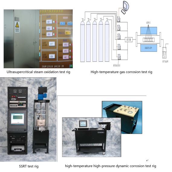 材料在亚临界到超超临界参数范围的流动蒸汽氧化试验、不同组分的高温烟气煤灰腐蚀试验、高温高压介质恒载荷蠕变试验、高温高压介质恒(慢)速率拉伸试验、高温高压介质腐蚀疲劳试验、 高温高压介质裂纹扩展试验、静态或动态高温高压介质挂片试验,以及静态或动态高温高压介质电化学腐蚀等多种腐蚀试验。